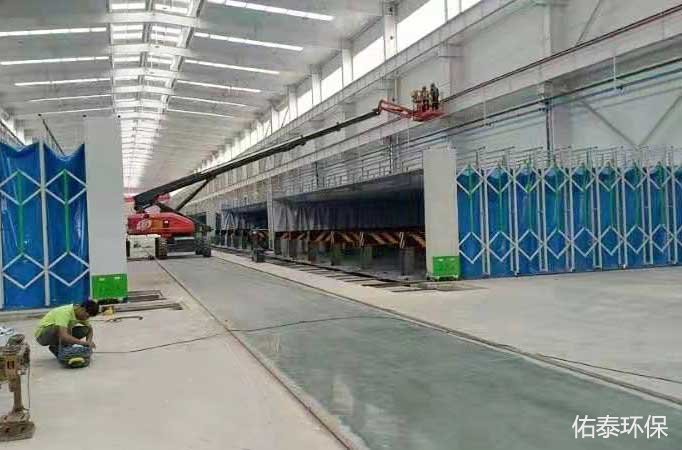 某鋼結(jié)構(gòu)廠需要一套大型全自動(dòng)移動(dòng)伸縮噴漆房,伸縮房可利用尺寸為長(zhǎng)40米,寬13米,高三米,通過與客戶的溝通與實(shí)地考察,伸縮移動(dòng)式噴漆房制作方案如下。龍門框架使用40*60*1.5MM201不銹鋼方管焊接,控制連桿使用30*50*1.5MM矩形管數(shù)控轉(zhuǎn)塔-沖孔,菱形大斜杠與小斜杠使用20*40*1.2MM矩形方管制作,電機(jī)及減速機(jī)4套,密封布使用平方520G阻燃刀刮布,照明使用LED防爆燈。伸縮移動(dòng)噴漆房廢氣處理采用氣旋塔,干式過濾器,催化燃燒設(shè)備聯(lián)合處理。其中氣旋噴淋塔解決大部分漆霧顆粒,干式過濾器再次凈化噴漆房廢氣中的顆粒物質(zhì),催化燃燒設(shè)備處理噴漆房廢氣中的甲苯,二甲苯等有機(jī)廢氣。