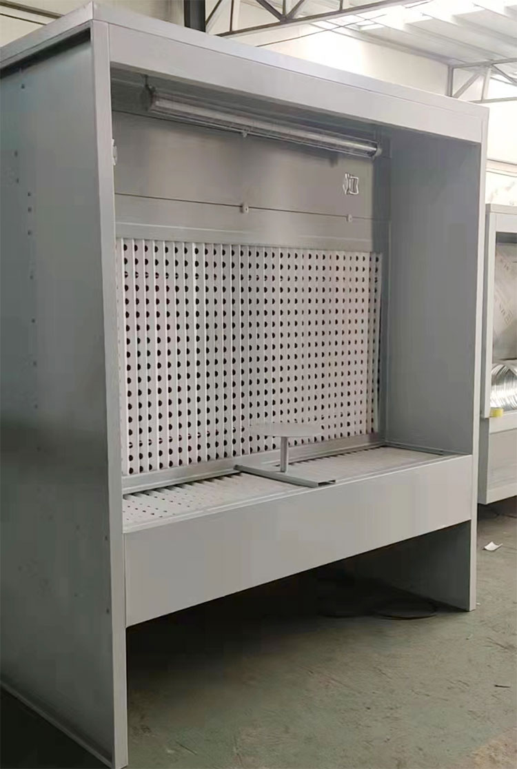 具體尺寸 | 箱體尺寸長2.0米,寬1.0米,高2.3米,臺面高度0.75米,臺面深度0.5米。臺面上附V型過濾紙。臺面帶小轉盤。吸附層使用V型過濾紙。抽屜層過濾使用漆霧過濾棉。 防爆燈一盞。 | ||