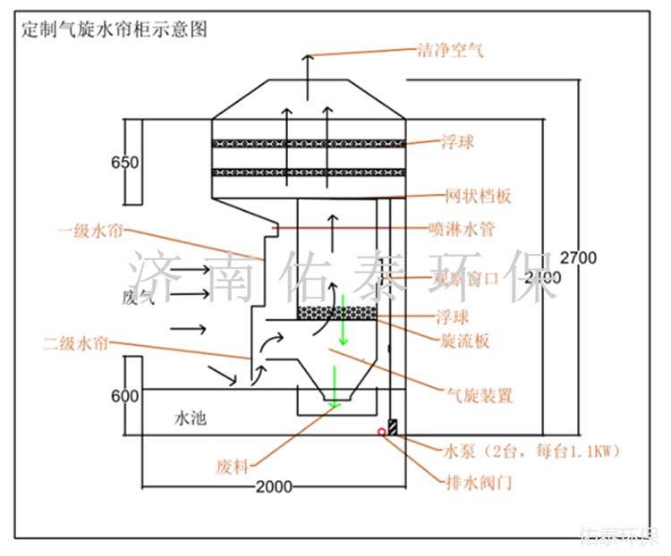 2.設(shè)備結(jié)合水簾、噴淋、氣旋式的優(yōu)點設(shè)備運(yùn)行中使廢氣與水混合充分混合,從而提高廢氣處理效率。打破傳統(tǒng)的水簾廢氣處理方式。