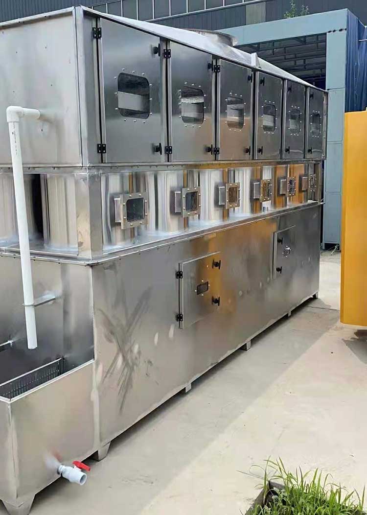 需要處理的含塵廢氣由風(fēng)管引入凈化塔,經(jīng)過旋流塔洗滌桶時(shí),風(fēng)帶加快,帶動(dòng)填料球飛快運(yùn)轉(zhuǎn)。在洗滌桶里,含塵廢氣與水霧充分混合洗滌,中和反應(yīng)(水里補(bǔ)充有酸堿時(shí))廢氣經(jīng)過凈化后,再清除霧層脫水除霧后由風(fēng)機(jī)排入大氣或再進(jìn)入其他凈化設(shè)備(光氧催化、低溫等離子等)。吸收液在塔底輕水泵增壓后在箱頂噴淋霧化而下,***后回流直箱底循環(huán)使用,凈化的廢氣達(dá)到國(guó)家排放標(biāo)準(zhǔn)。