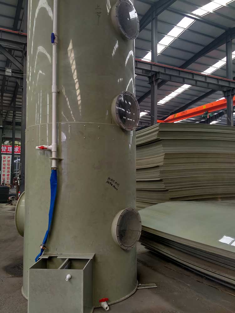 1.5萬風(fēng)量酸霧凈化塔規(guī)格為:ф1.8m*H4.0m*10mm。進(jìn)、出風(fēng)口直徑均為600mm。循環(huán)水量每小時(shí)22立方。每小時(shí)處理廢氣量16800立方。凈化塔整體厚度為10mm PP板。