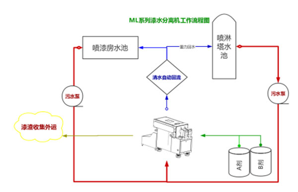 工作流程:污水→設(shè)備+藥劑=清水(回用)+漆渣(自動(dòng)分離)