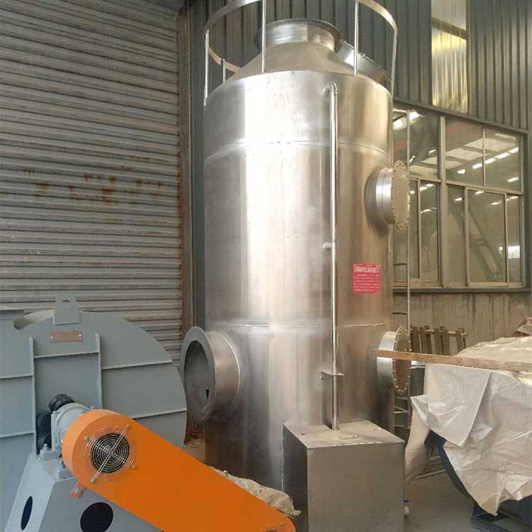 1.1、噴淋塔分單塔和雙塔兩種。使用環(huán)形塔體,采用蘭分段連接制成。主要包括儲液箱、塔體、進風段、噴淋層、填料層、旋流除霧層、觀察窗、出風口等部分。本酸霧凈化塔為環(huán)形塔體,由聚丙烯、PVC等材料通過法蘭連接分段制成。其具體結(jié)構(gòu)由進氣段、填料層、二級噴淋段、旋流板、出氣口、管路等部分組成。PP酸霧凈化塔效果好,抗腐蝕能力強,強度高,噪音低,省電省力,拆裝維護方便。