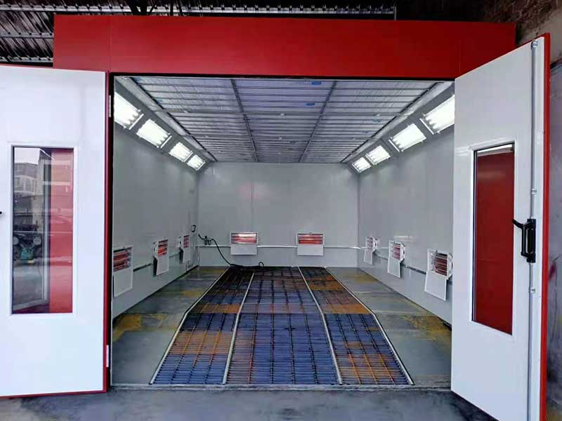 二、 烤漆時,將風(fēng)門調(diào)至烤漆位置,熱風(fēng)循環(huán),烤房內(nèi)溫度迅速升高到預(yù)定干燥溫度(55℃—60℃)。風(fēng)機將外部新鮮空氣進行初過濾后,與熱能轉(zhuǎn)換器發(fā)生熱交換后送至烤漆房頂部的氣室,再經(jīng)過第二次過濾凈化,熱風(fēng)經(jīng)過風(fēng)門的內(nèi)循環(huán)作用,除吸進少量新鮮空氣外,絕大部分熱空氣又被繼續(xù)加熱利用,使得烤漆房內(nèi)溫度逐步升高。當溫度達到設(shè)定的溫度時,燃燒器自動停止;當溫度下降到設(shè)置溫度時,風(fēng)機和燃燒器又自動開啟,使烤漆房內(nèi)溫度保持相對恒定。***后當烤漆時間達到設(shè)定的時間時,烤漆房自動關(guān)機,烤漆結(jié)束。